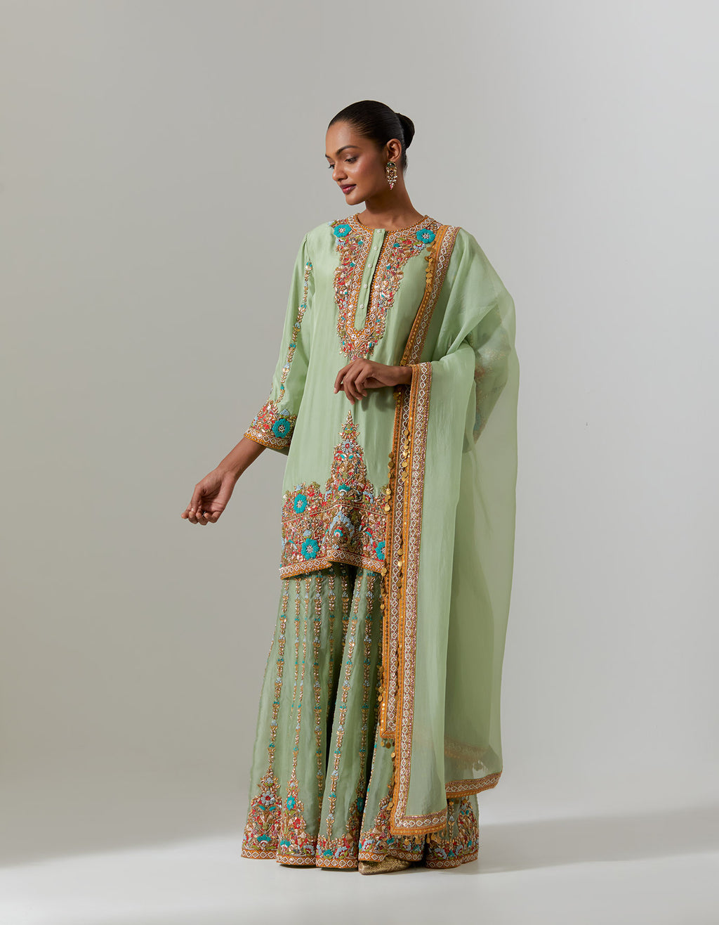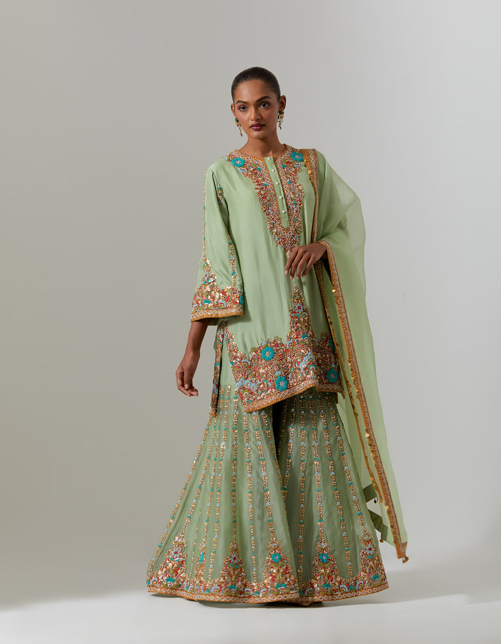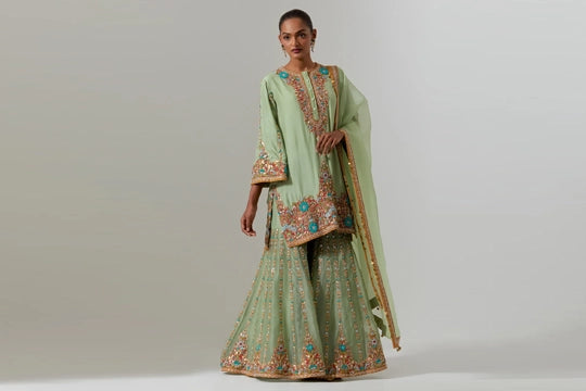 Green Heavy Paisly Emb. Sharara With Organza Polash Short Jactet Wit Dupatta