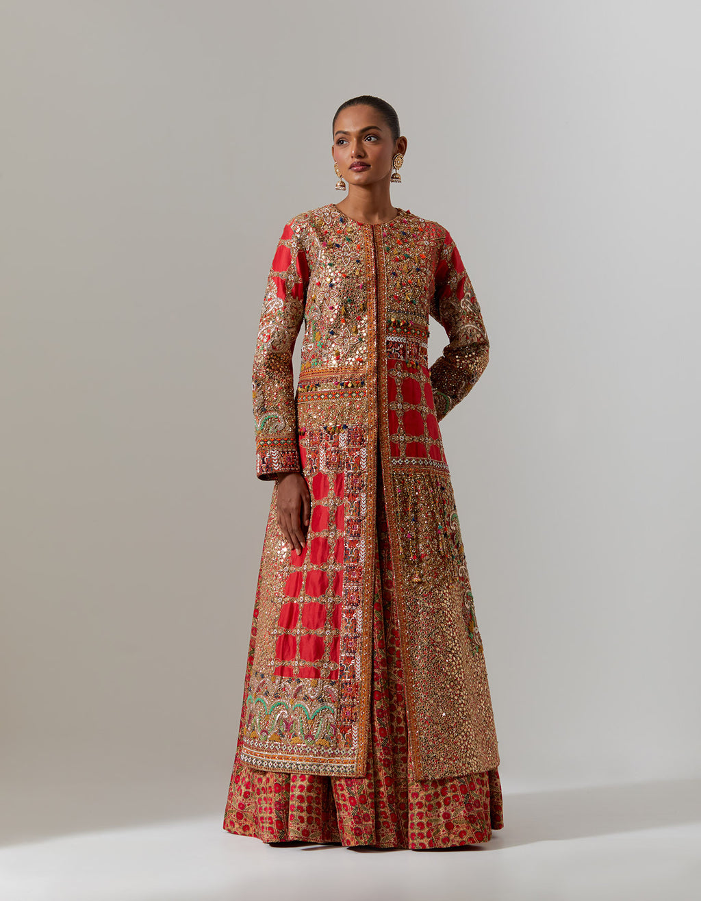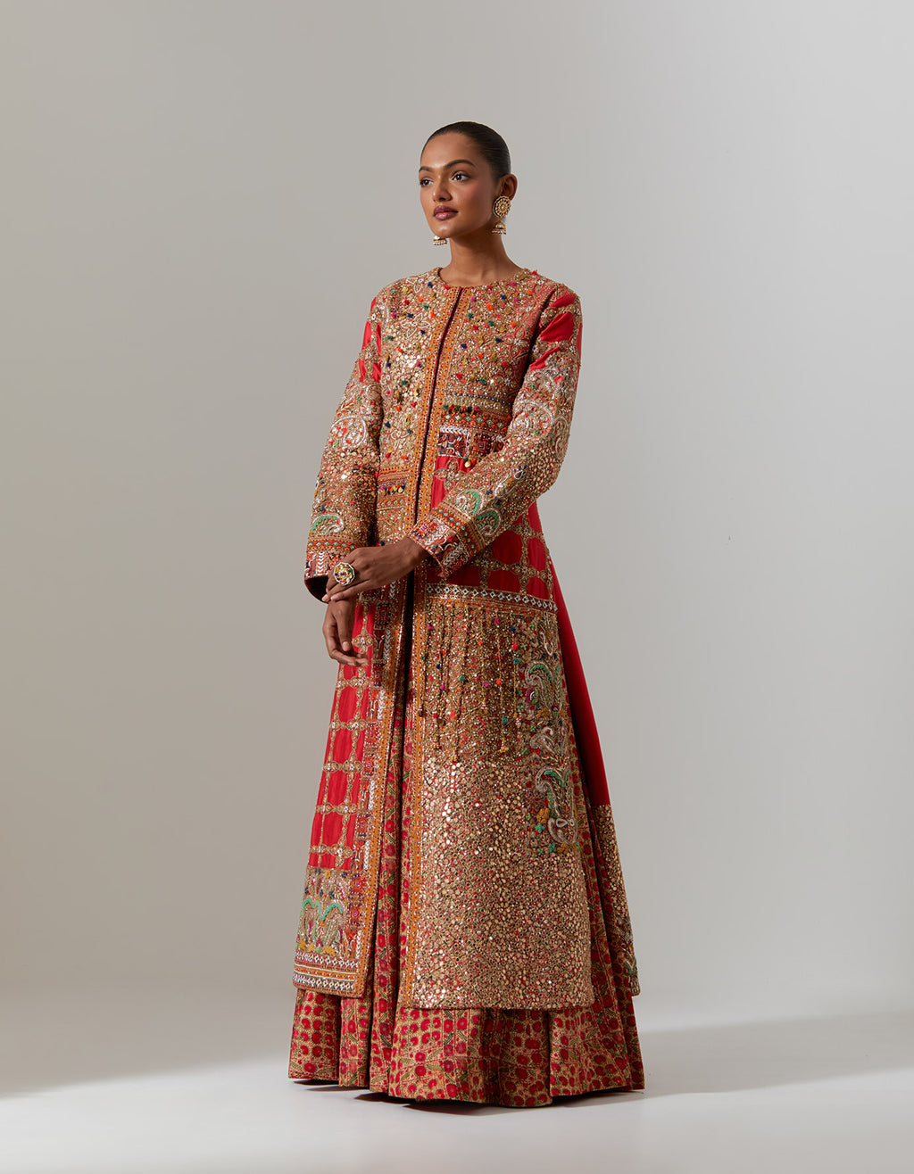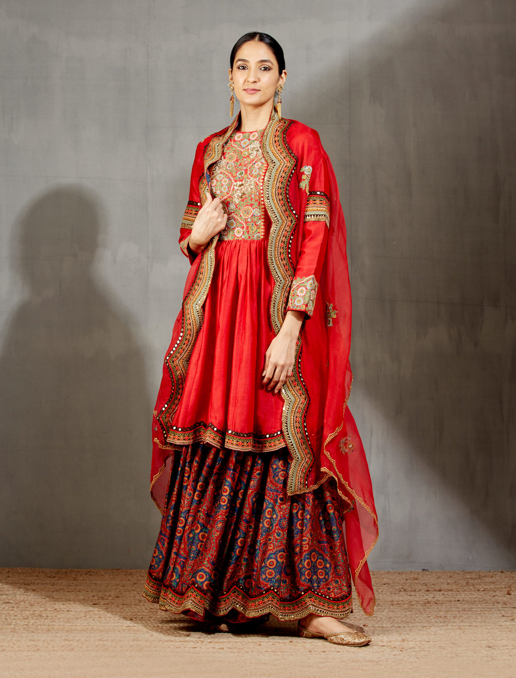 Red Pitta Kalidar With Chota Gulab Printed Shrug And Dupatta
