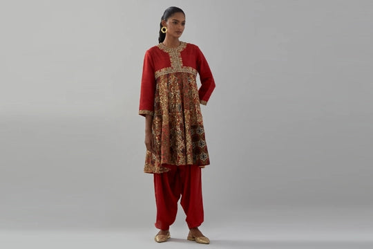 Red New Begum Kurta With Pleat Salwar And Dupatta