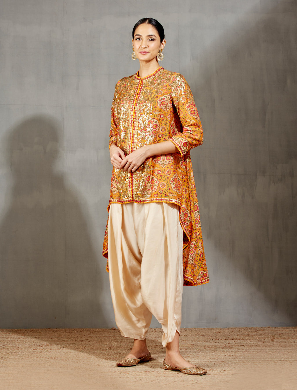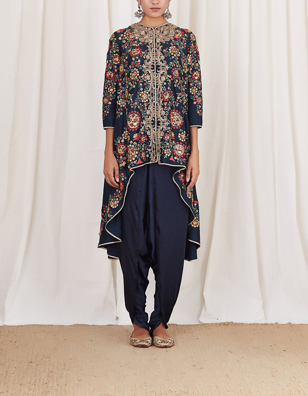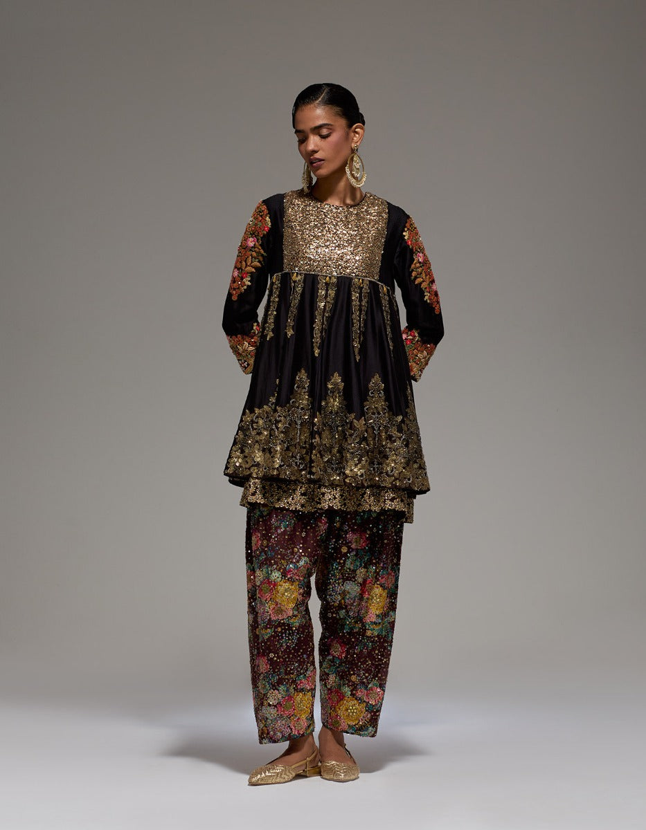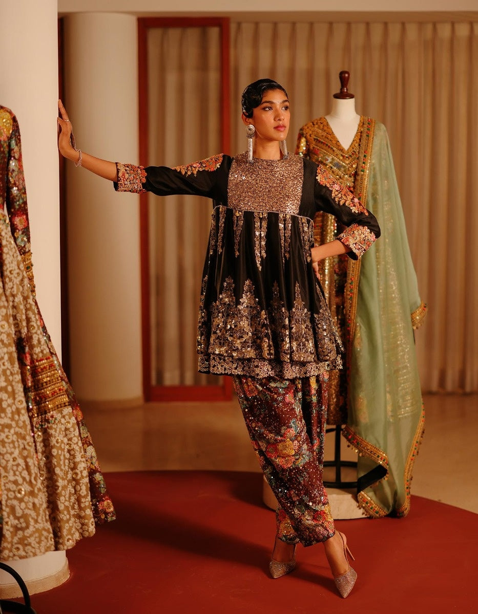 Black Short Kurta With Printed Shimmer Dhoti Pants