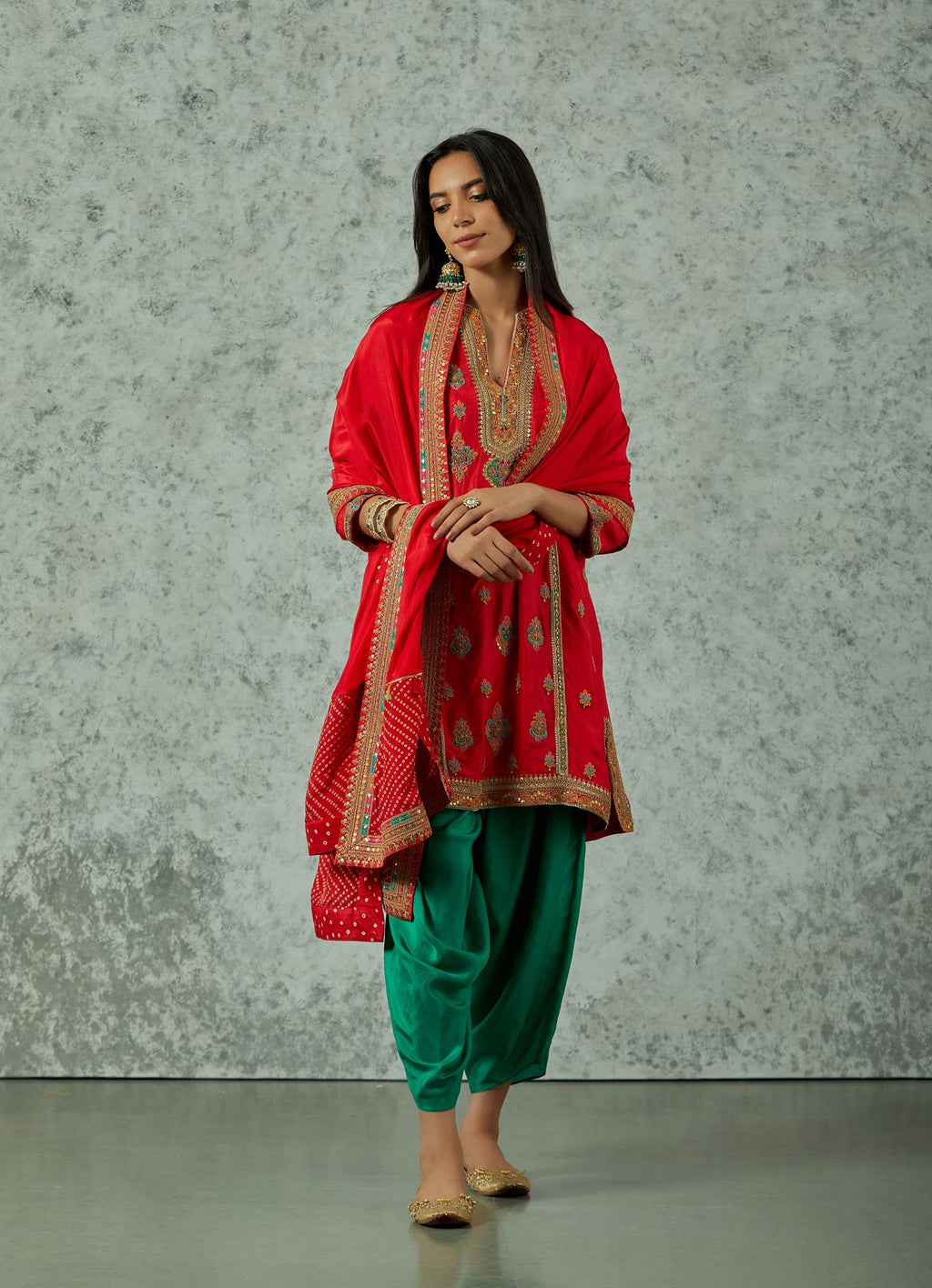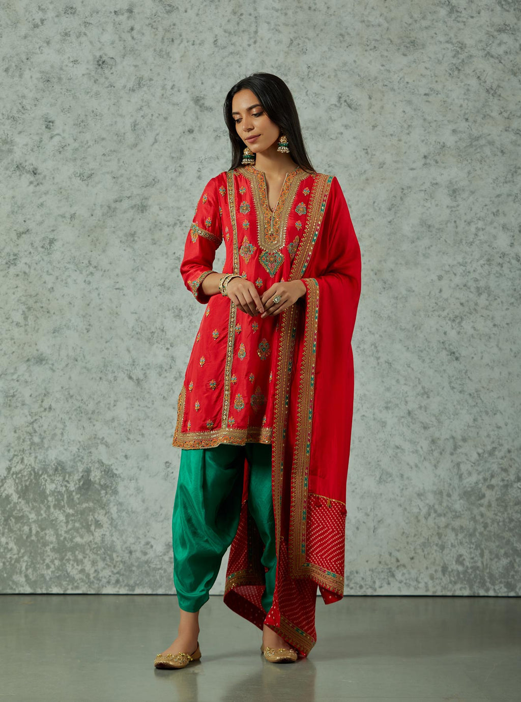 Red Kurta Set with Tulip Pants and a Printed Dupatta