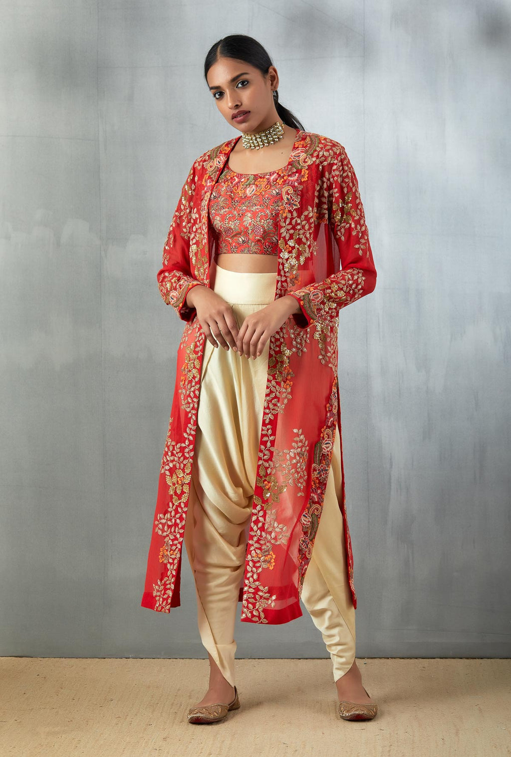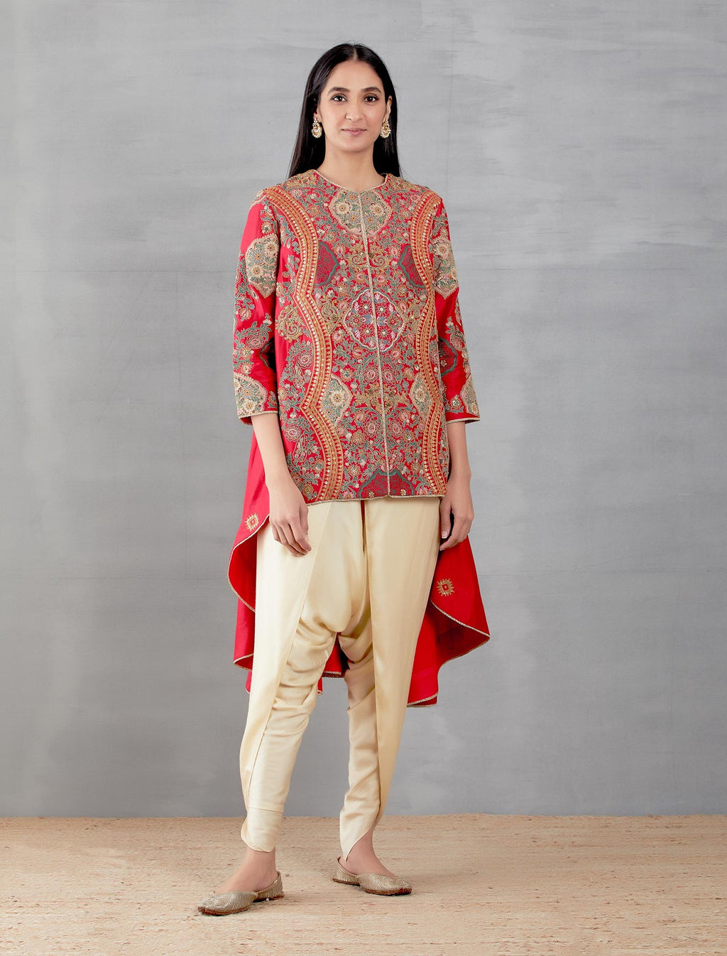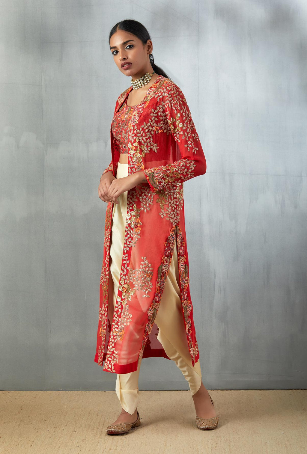 Red Organza Flared Tunic with Off White Dhoti Pants