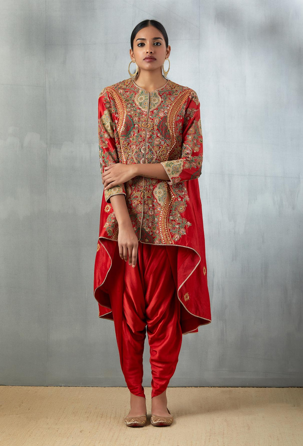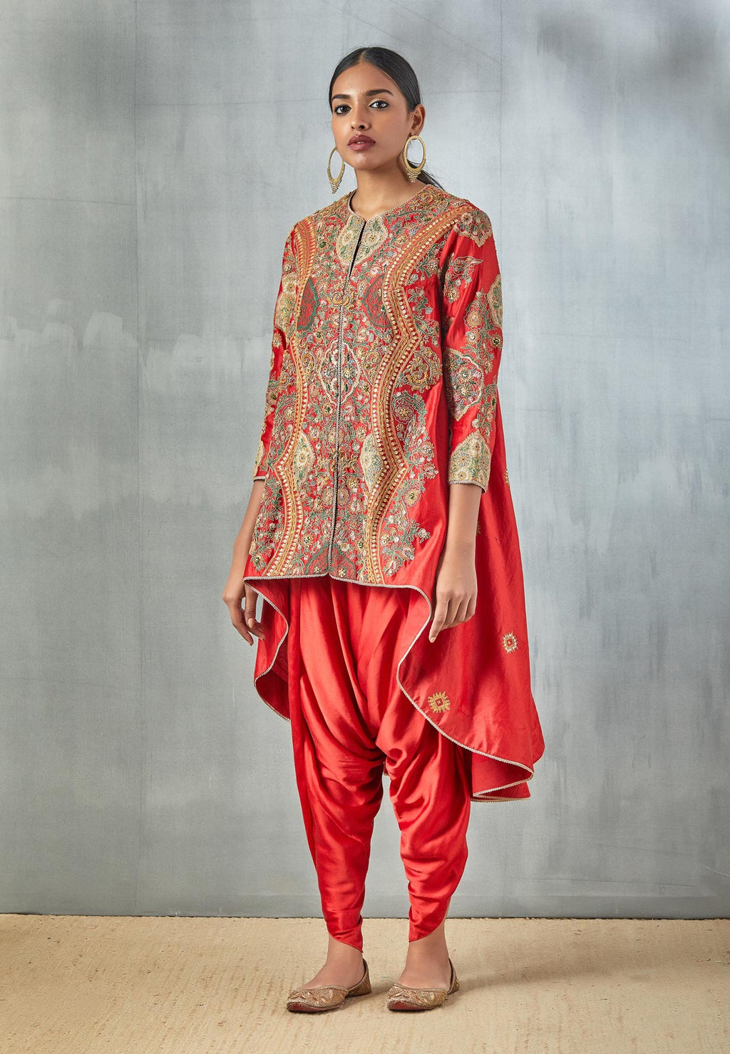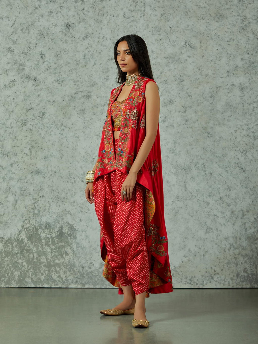 Red Dhoti Set with a Heavy Embroidered on Print Short Jacket Set