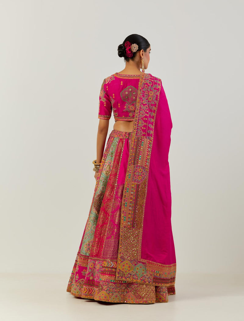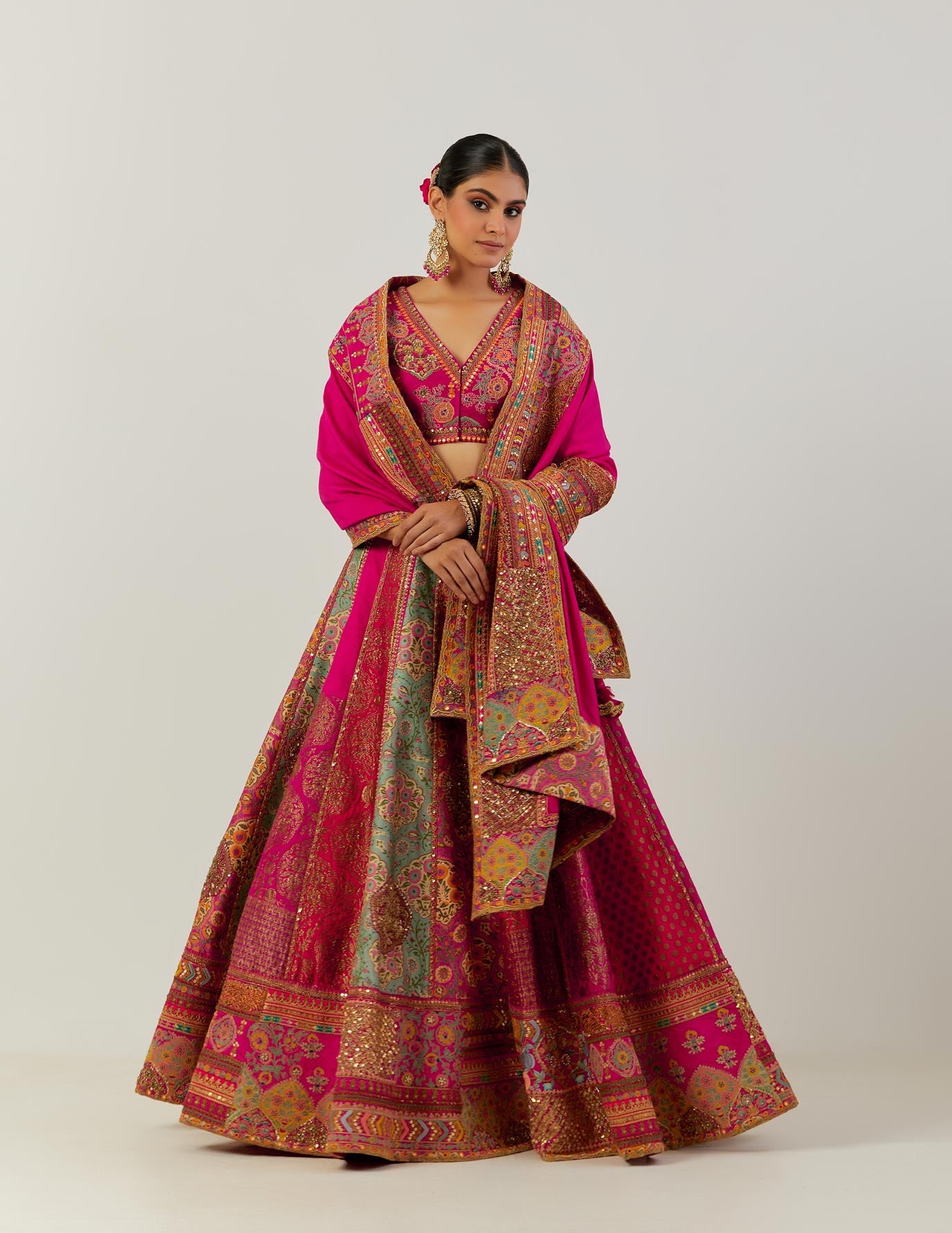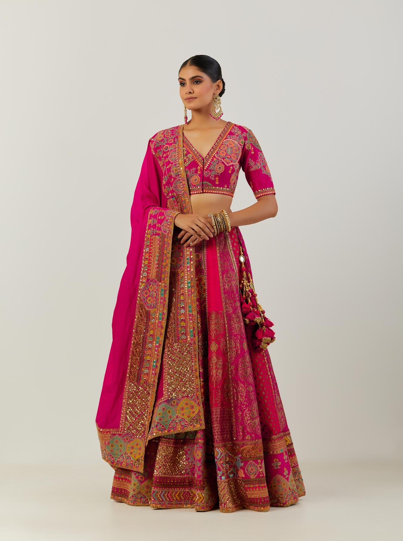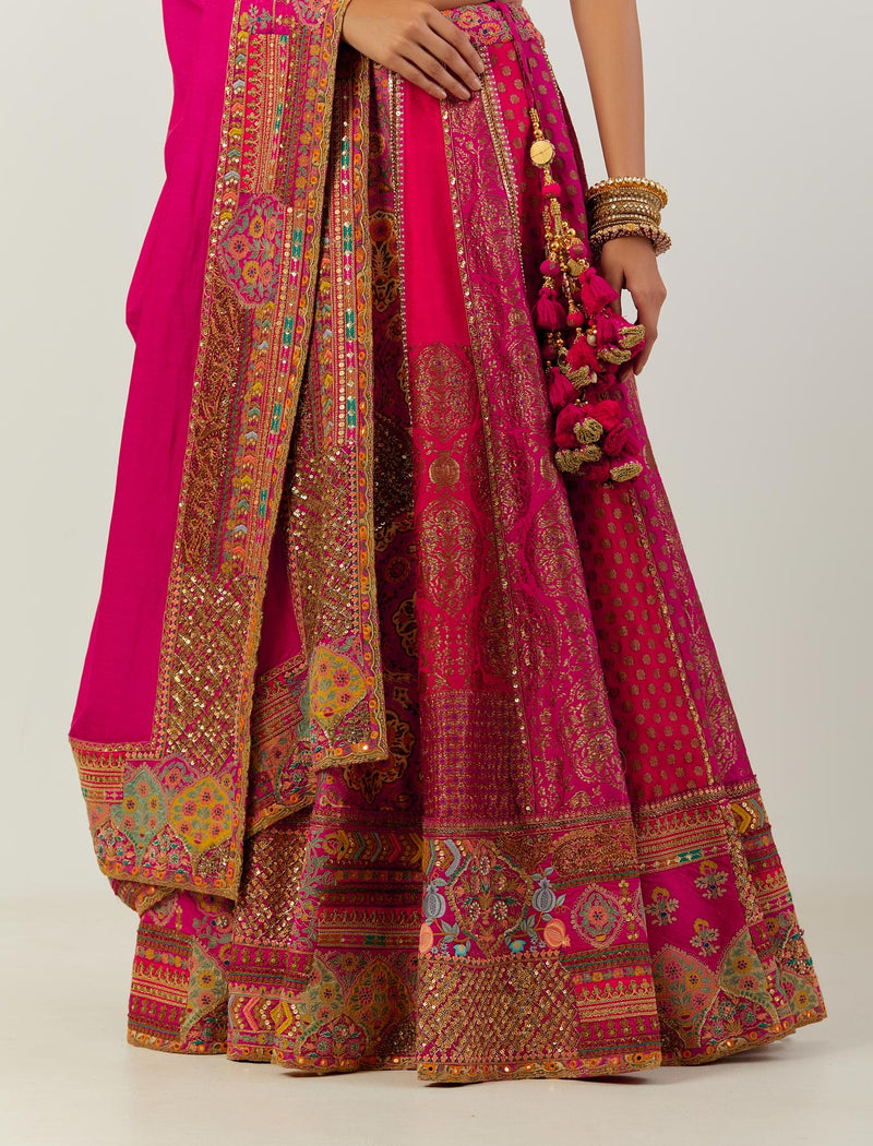 - Magenta and Red Brocade Multi Pannel Lehenga With Blouse And Dupatta