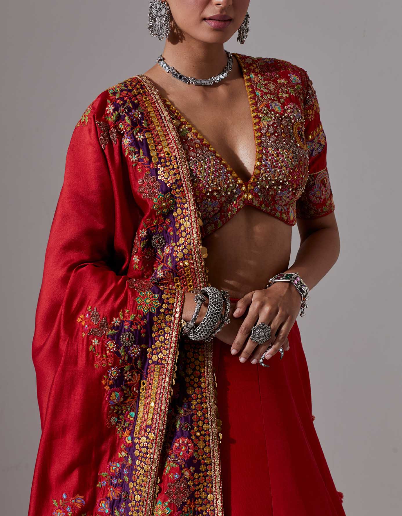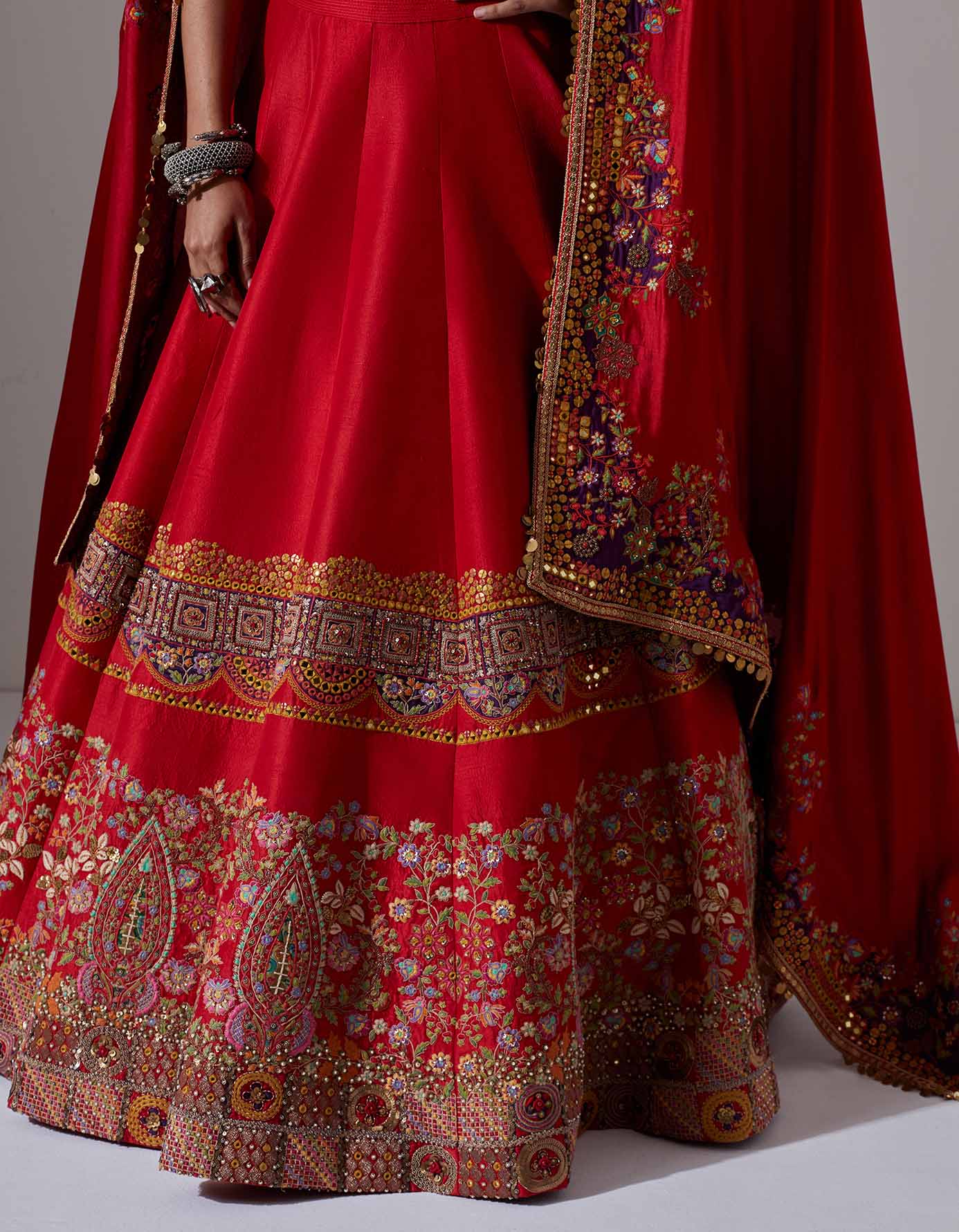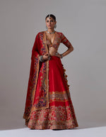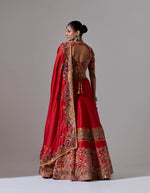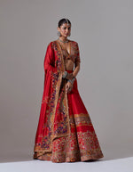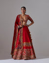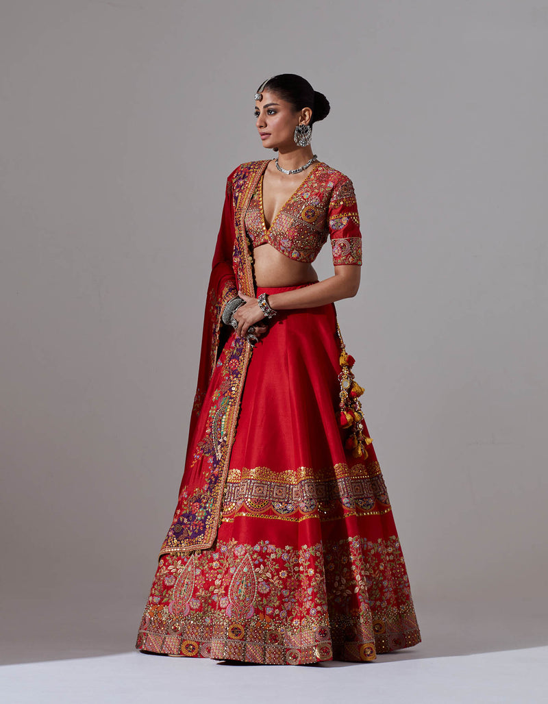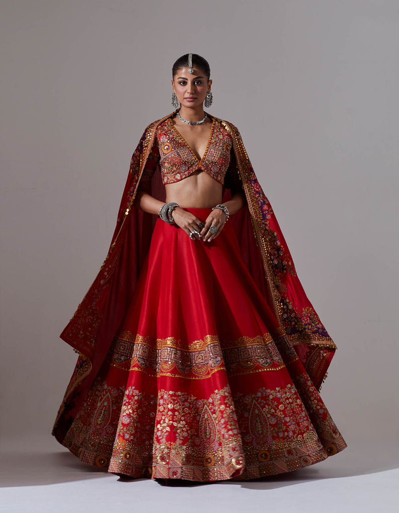 - Red lehenga with jaal and tikai hand embroidery with a blouse and a dupatta