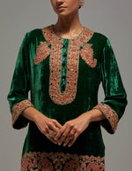 Timeless silhouettes meet old-world charm - the Samia Kurta Set, crafted from luxurious velvets is your go-to for winter soirées. Available in jewel tones of maroon and emerald green.