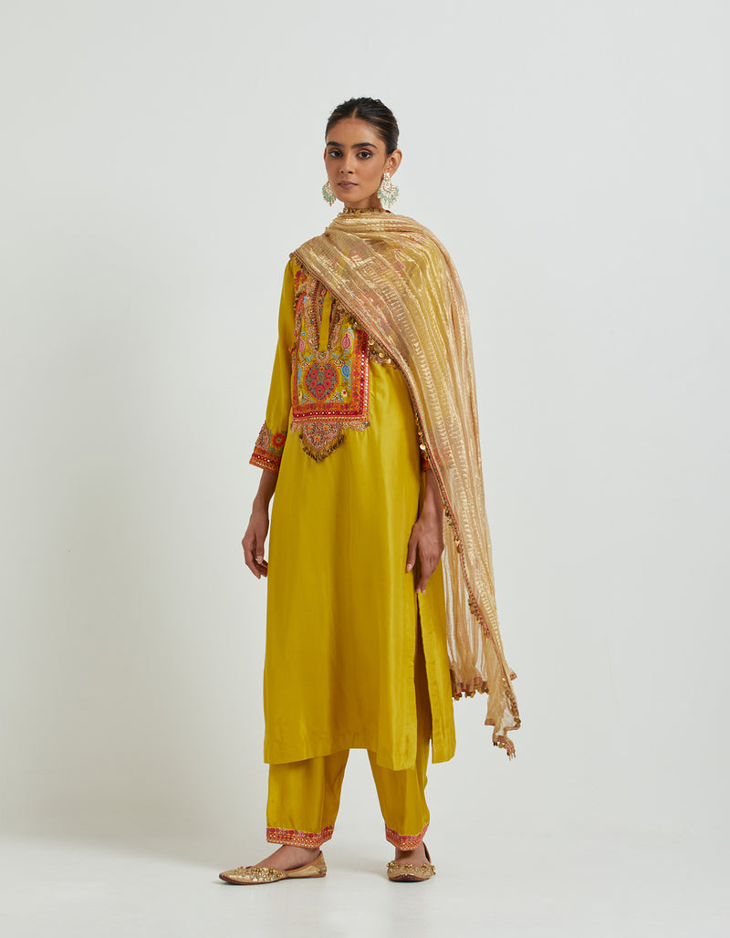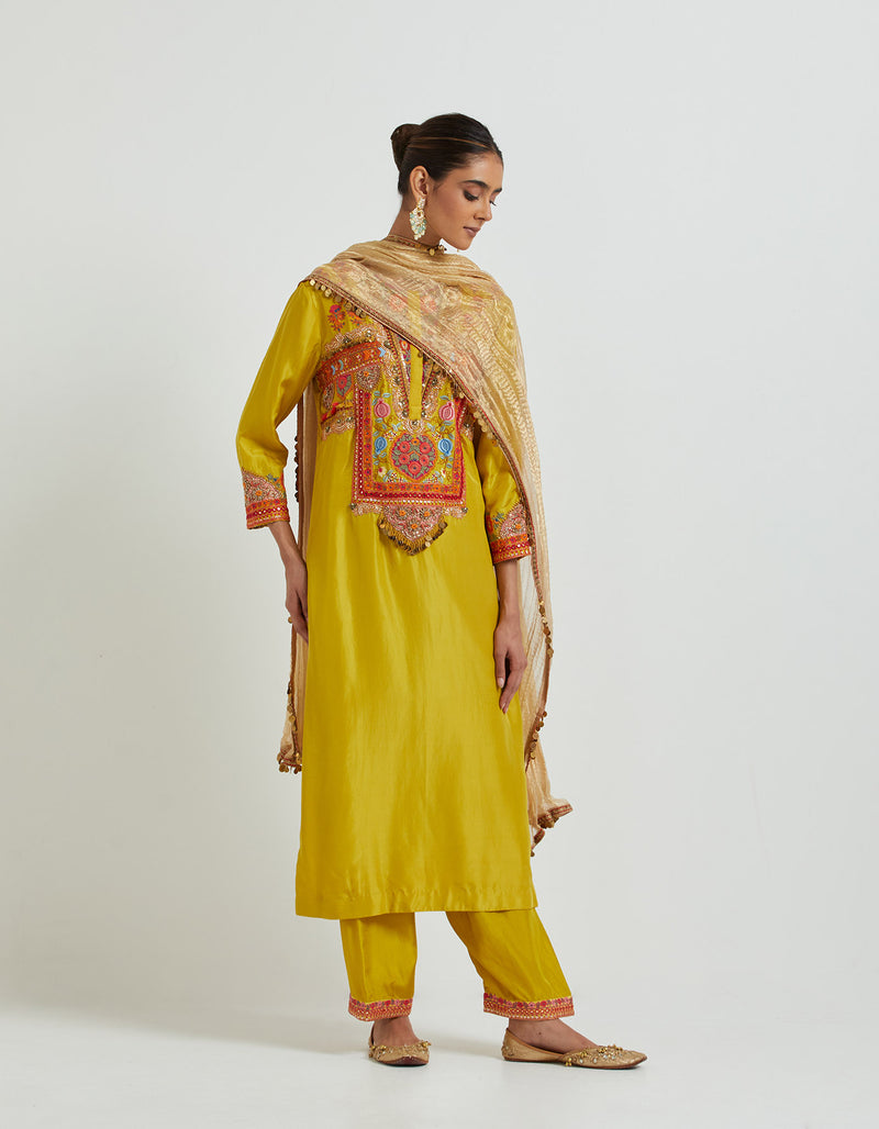 - Mustard kurta set with yoke embroidery paired with a crinkled tissue dupatta