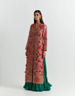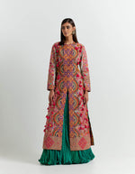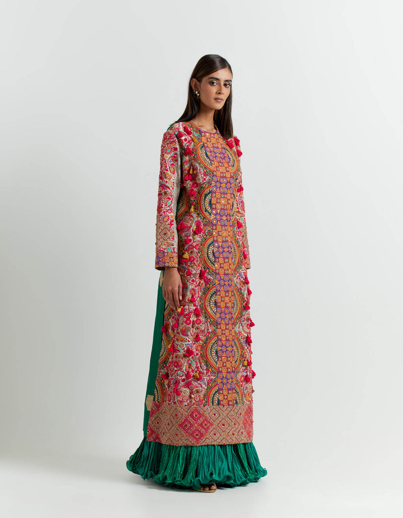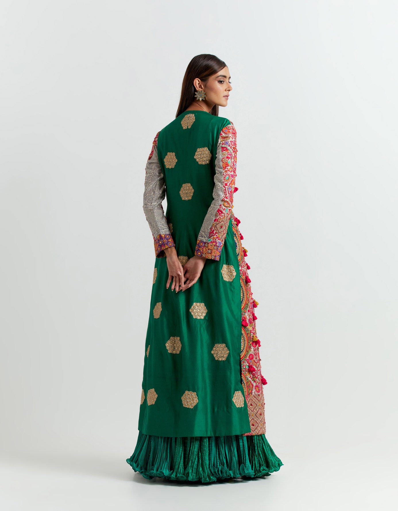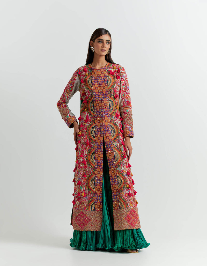 - Multi coloured jacket with an emerald crushed skirt