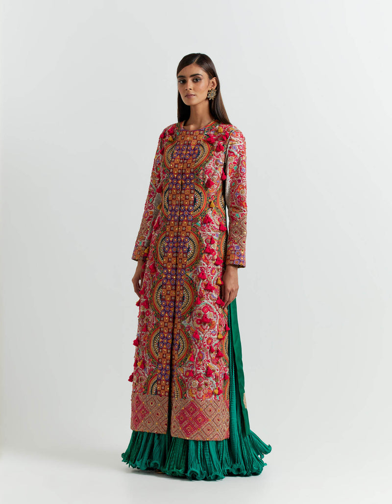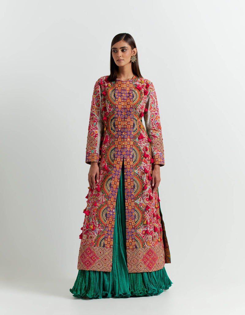Multi Coloured Jacket with an Emerald Crushed Skirt