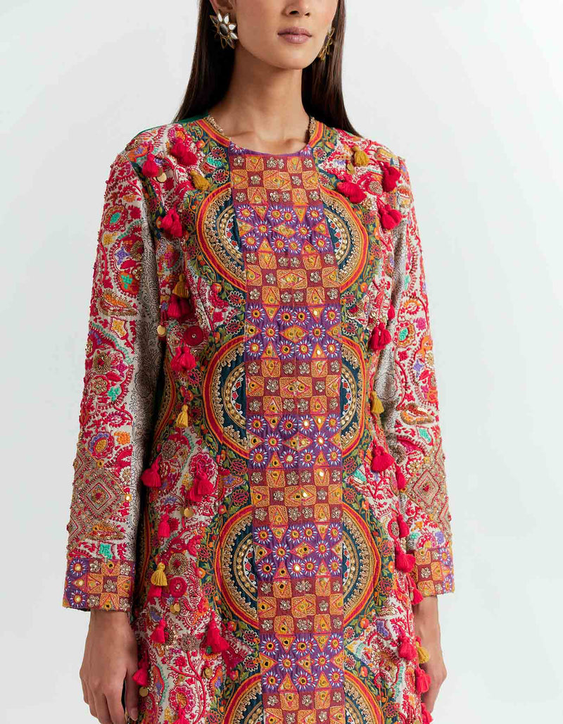 - Intricate hand and machine embroidery