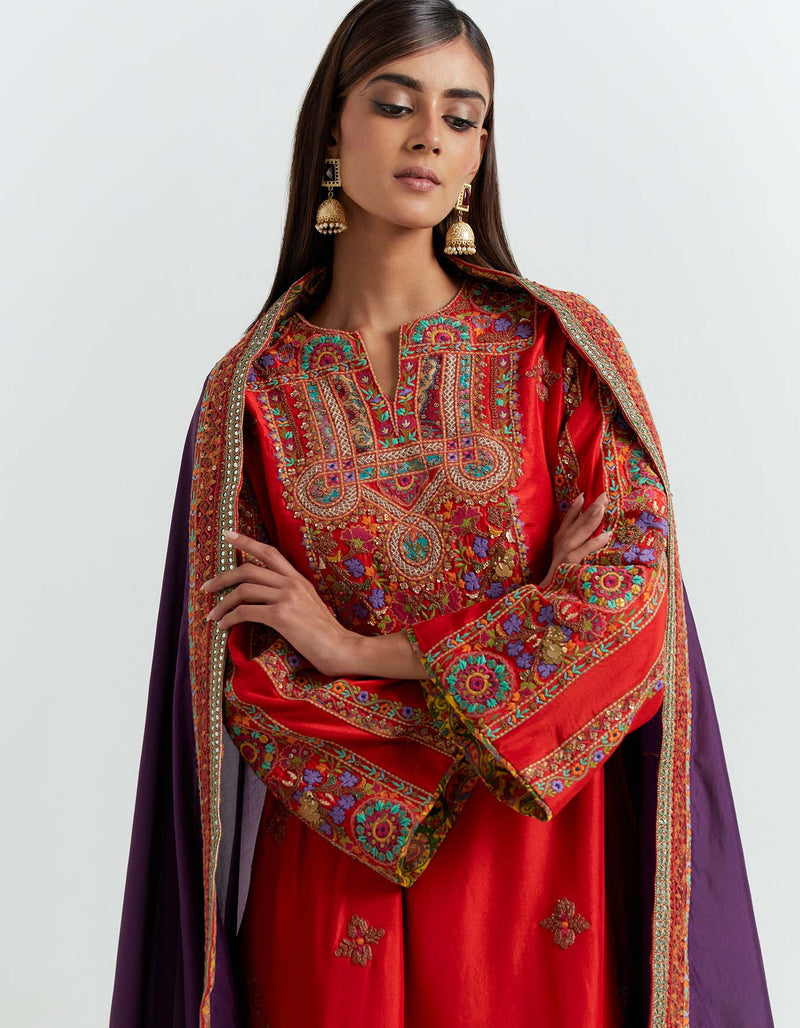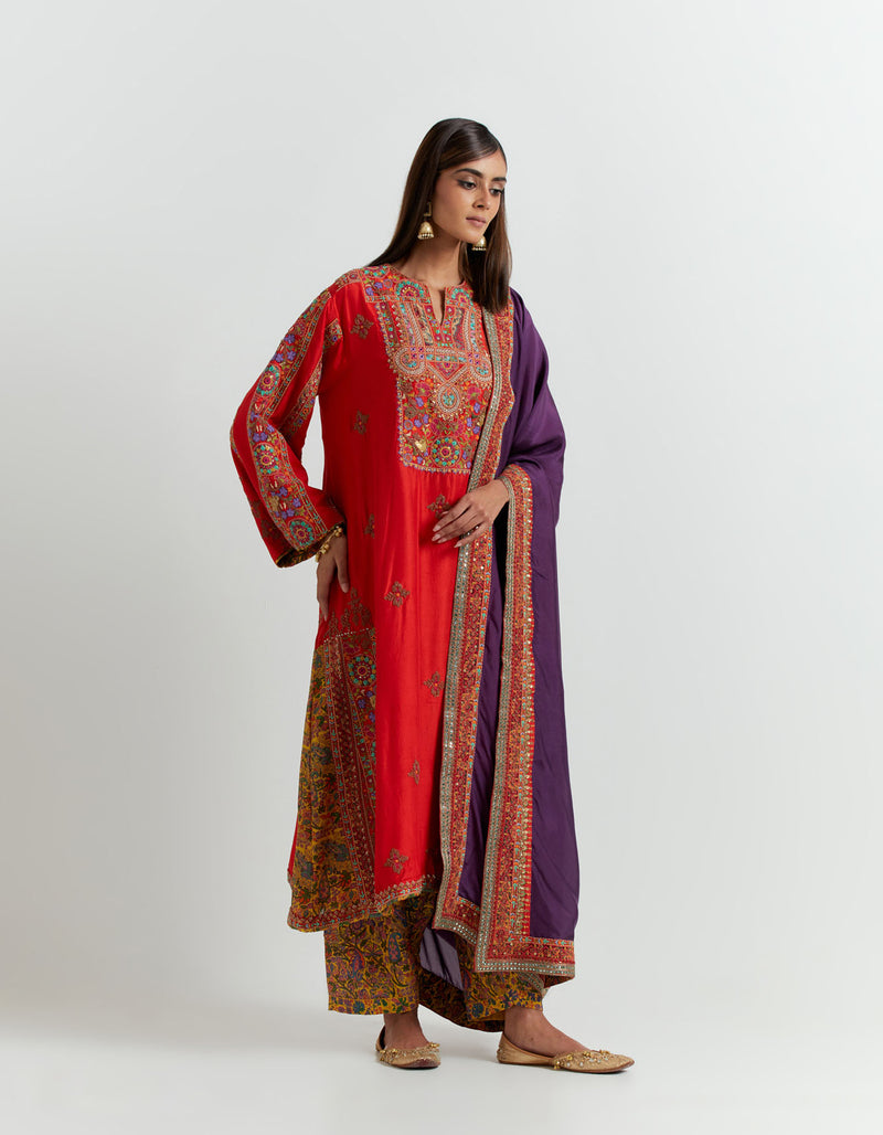 - Paired WithEmbroidered Dupatta And Pleated Salwar
