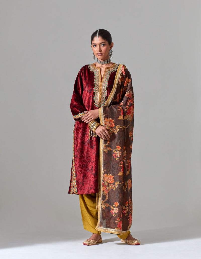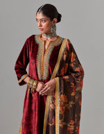 Maroon Printed Velvet Firan Yoke Kurta with Pleated Salwar